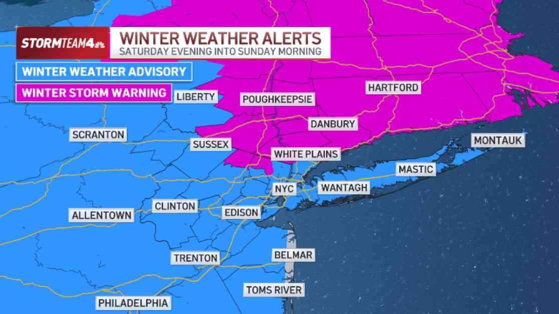 Moving towards the Hudson Valley, northern New Jersey, and vast portions of Connecticut, snowfall amounts ranging from 5-8 inches are projected. Central Jersey anticipates 1-3 inches, whereas Southern Jersey is likely to receive even less snow. The winter storm warning for areas north of New York City is scheduled to take effect at 5 p.m. on Saturday and remain in force until Sunday at noon. Concurrently, a winter weather advisory will be initiated for New York City, Long Island, and a significant portion of New Jersey during the same timeframe.